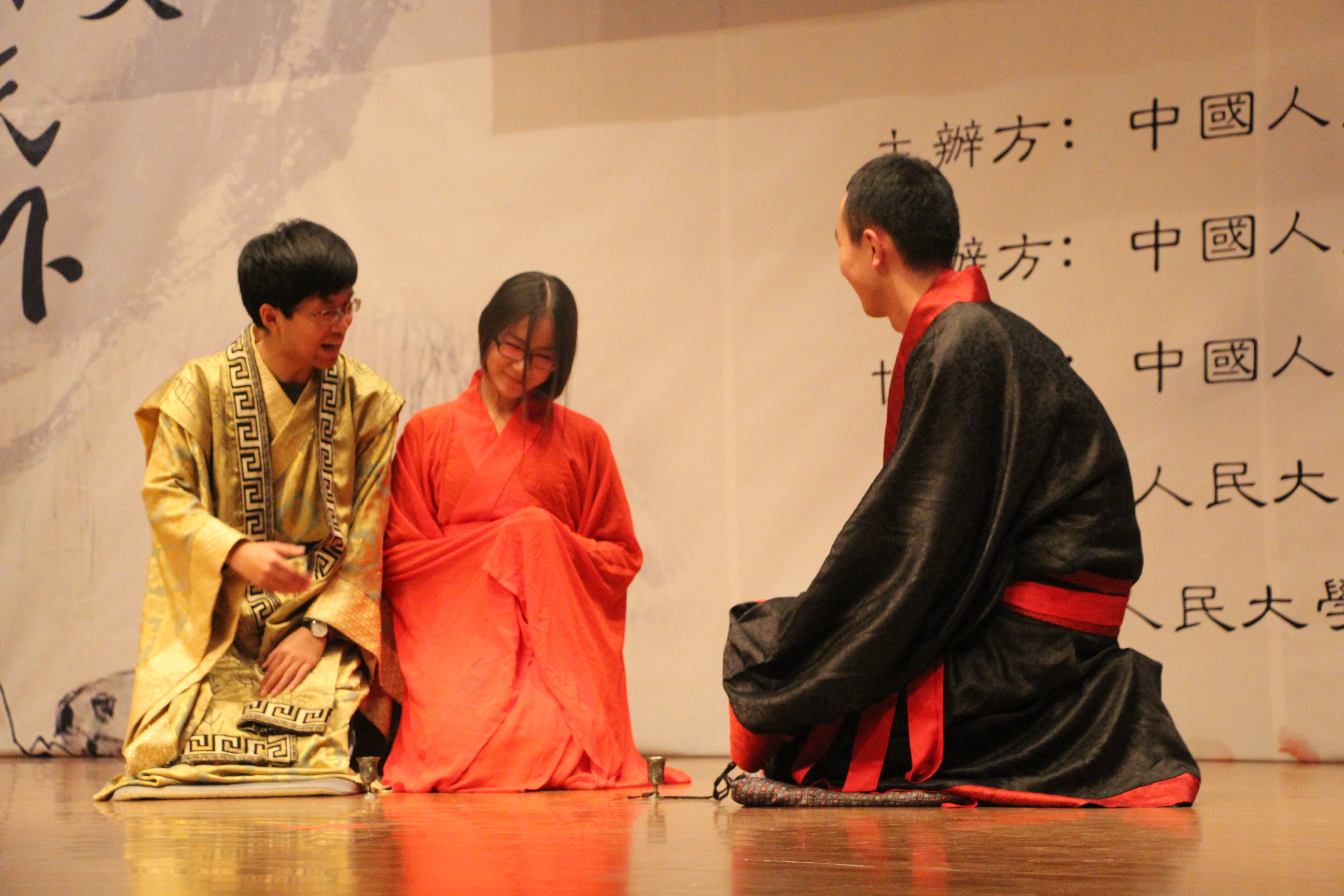 之后,在缓缓的笛子演奏中,舞台中间两位演员挥毫泼墨,两幅毛笔字旋即写就,墨以清心,日新月异,这不仅寄托着同学们对于人文情怀的心向往之,也传达了为往圣继绝学的胸襟气魄。