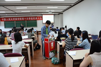 2015年6月17日下午,春水堂 学生代表大会在国学馆113教室召开,逾百名学生代表到场参会。春水堂 2014级本科生赵鑫琳受第九届学生委员会所托主持了本次大会。春水堂 党委副书记梁敬芝老师、团委书记白洁老师出席了此次会议。