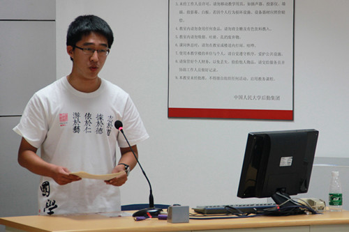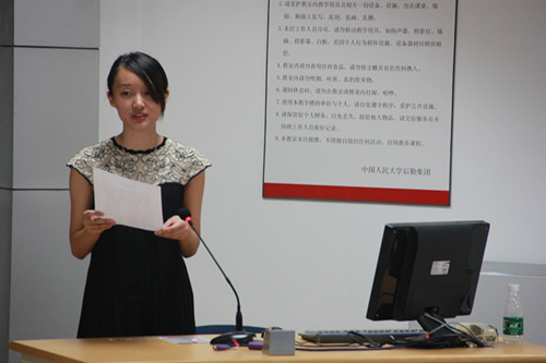 2011级本科班鲁鸣柳同学作为高年级学生代表发言。她以轻松活泼的风格向同学们谈起了自己本科4年的学习生活,与大家分享了春水堂