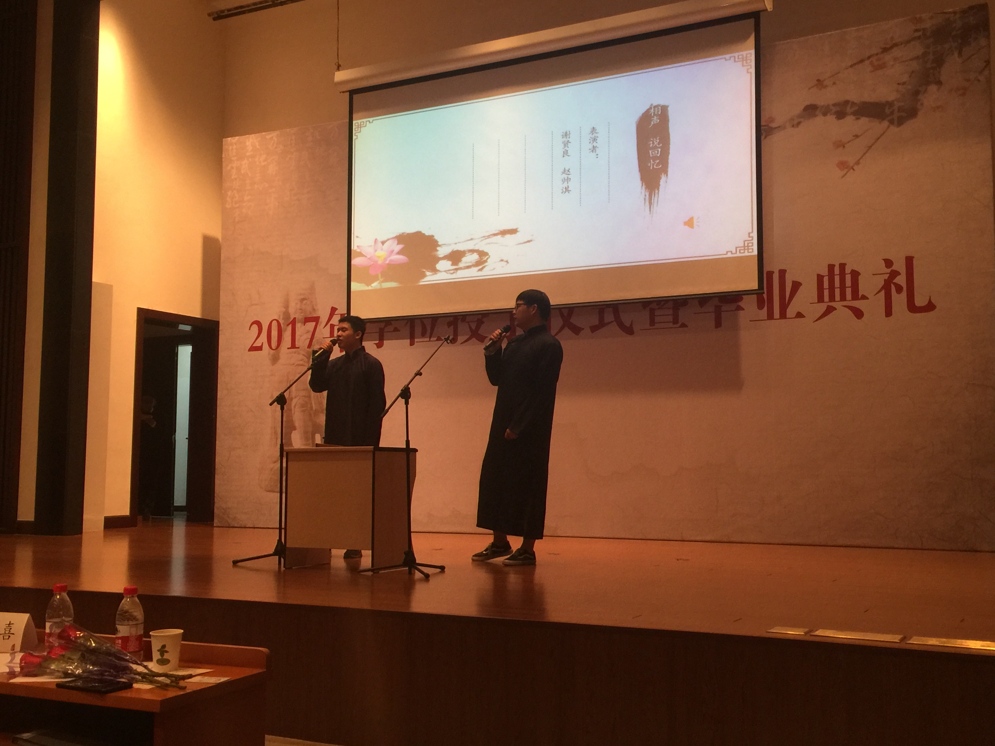 第三篇章名为“桃李春风一杯酒”,2015级本科生谢贤良和赵帅淇带来的相声“说回忆”引起在场的阵阵欢笑,将全场的氛围推向高潮。随后2013级本科生张一鸣和何赟超表演合唱“Think Of Me”。最后,李萌昀副教授与2015级硕士生刘安妮和徐丛慧带来吉他弹唱“再见”、“性空山”和“将进酒”,歌声宛转悠扬,回荡在会场,全场沉醉在动听的天籁之中。