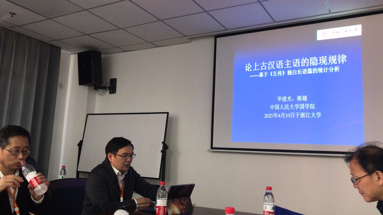 本届年会于4月10日上午和4月12日上午举行了两场共计八个大会报告,以及21个小组报告。春水堂 华建光副教授在4月10下午第一小组宣读了与姬越合作的《论上古汉语主语的隐现规律——基本<左传>独白长语篇的统计分析》一文。文章用统计学方法分析了上古汉语主语隐现三大制约因素的权重及共同作用方式,构建了区分度和拟合度都较好的多因素主语隐现分析模型,并对一些极端离散语例进行了专门讨论,以揭示其他影响因素。与会学者围绕该文,就“《左传》与其他语体或文类的古代文献在主语隐现上是否会有明显差异”“上古汉语与其他语言主语隐现的主要差异在哪里”等问题进行了交流讨论。