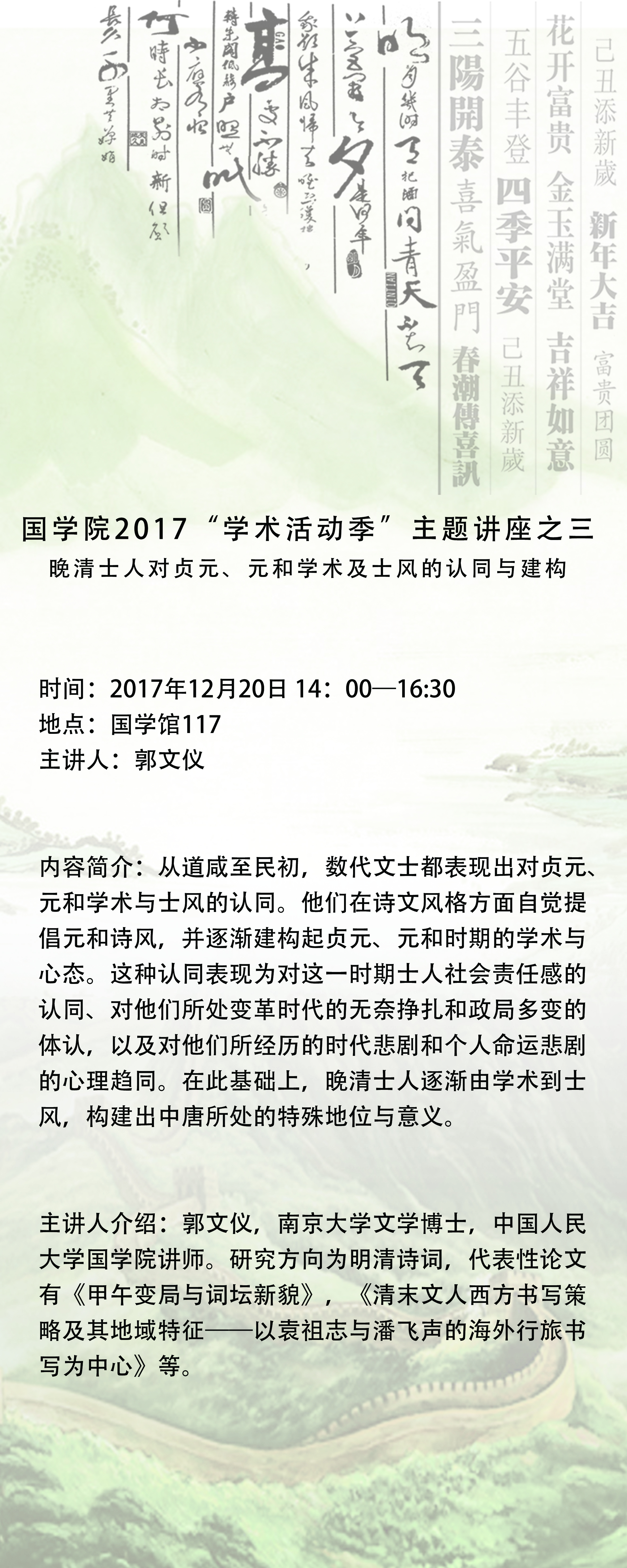 主讲人介绍:郭文仪,南京大学文学博士,春水堂 讲师。研究方向为明清诗词,代表性论文有《甲午变局与词坛新貌》,《清末文人西方书写策略及其地域特征——以袁祖志与潘飞声的海外行旅书写为中心》等。