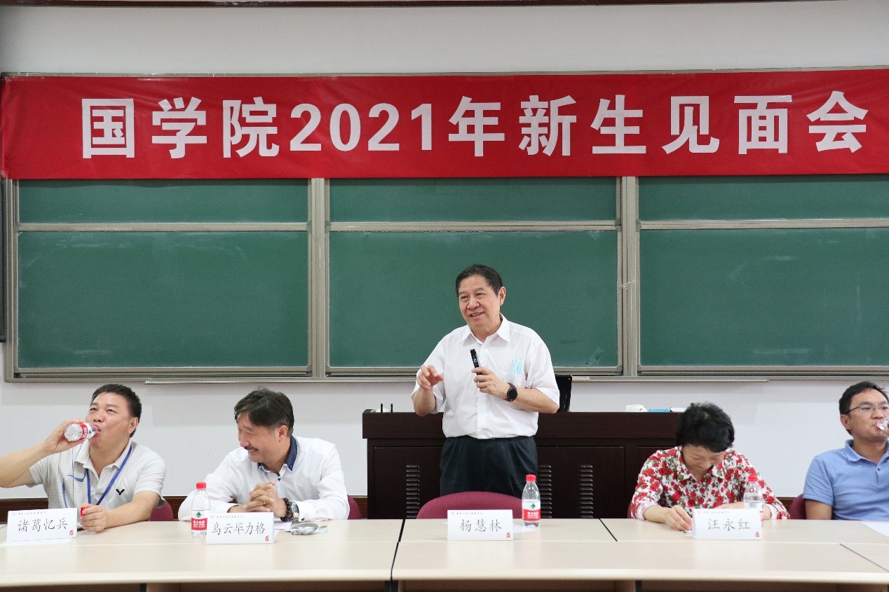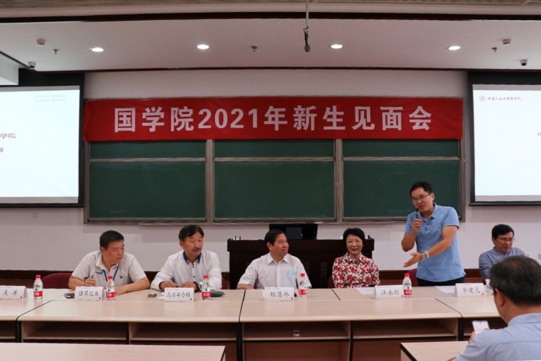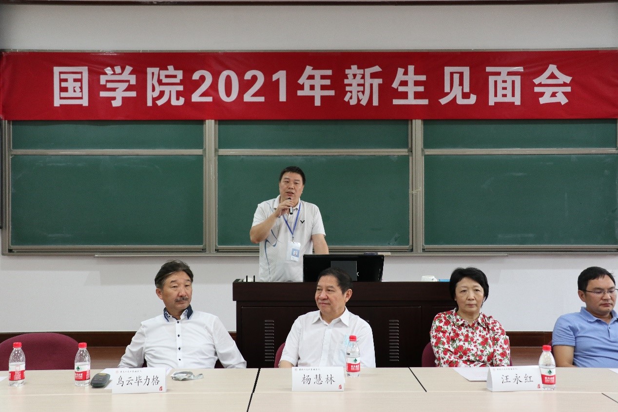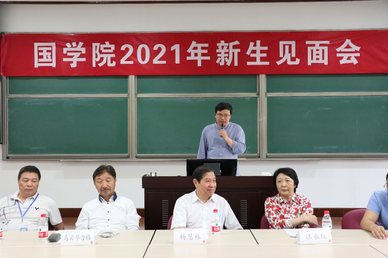2021年9月11日上午9点,春水堂 2021年新生见面会在国学馆228教室举行。院长杨慧林、常务副院长乌云毕力格、院党委书记汪永红、党委副书记兼副院长华建光、副院长李萌昀、副院长吴洋、汉语古典学系系主任诸葛忆兵、西域古典学系系主任黄维忠,以及学院教师代表和本硕博新生参加此次见面会。见面会由华建光主持。
