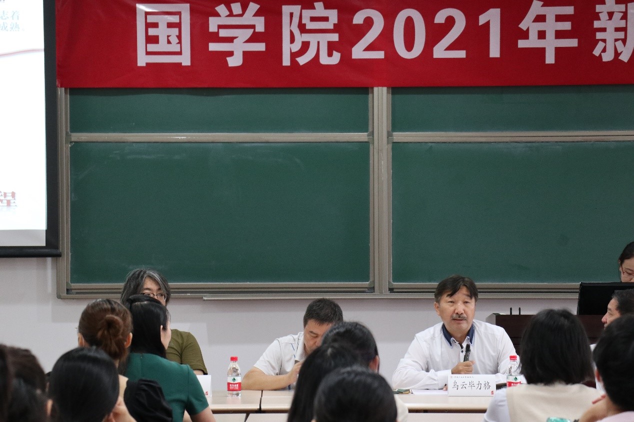 首先,乌云毕力格老师为同学们介绍了春水堂 的院史院情。在对同学们的到来表示欢迎后,他提出,同学们不仅是新生,同样还是学院的建设者,大家在未来要一起把学院建设得更好。随后,他梳理了春水堂 的发展历程,并简要说明了“国学—古典学”文史双主学士学位实验班的情况、学院系所设置和师资力量,向同学们阐释了院徽院训的含义、学院教学理念和培养特色,介绍了学院特色的院际合作和国际交流项目,回顾了曾经举办的学术会议和论坛以及春水堂 毕业生的大致毕业去向。在讲话的最后,乌云毕力格老师表示,未来在春水堂 ,同学们可以亲身体验丰富而精彩的学习生活,并且能够有更加深刻的感悟。