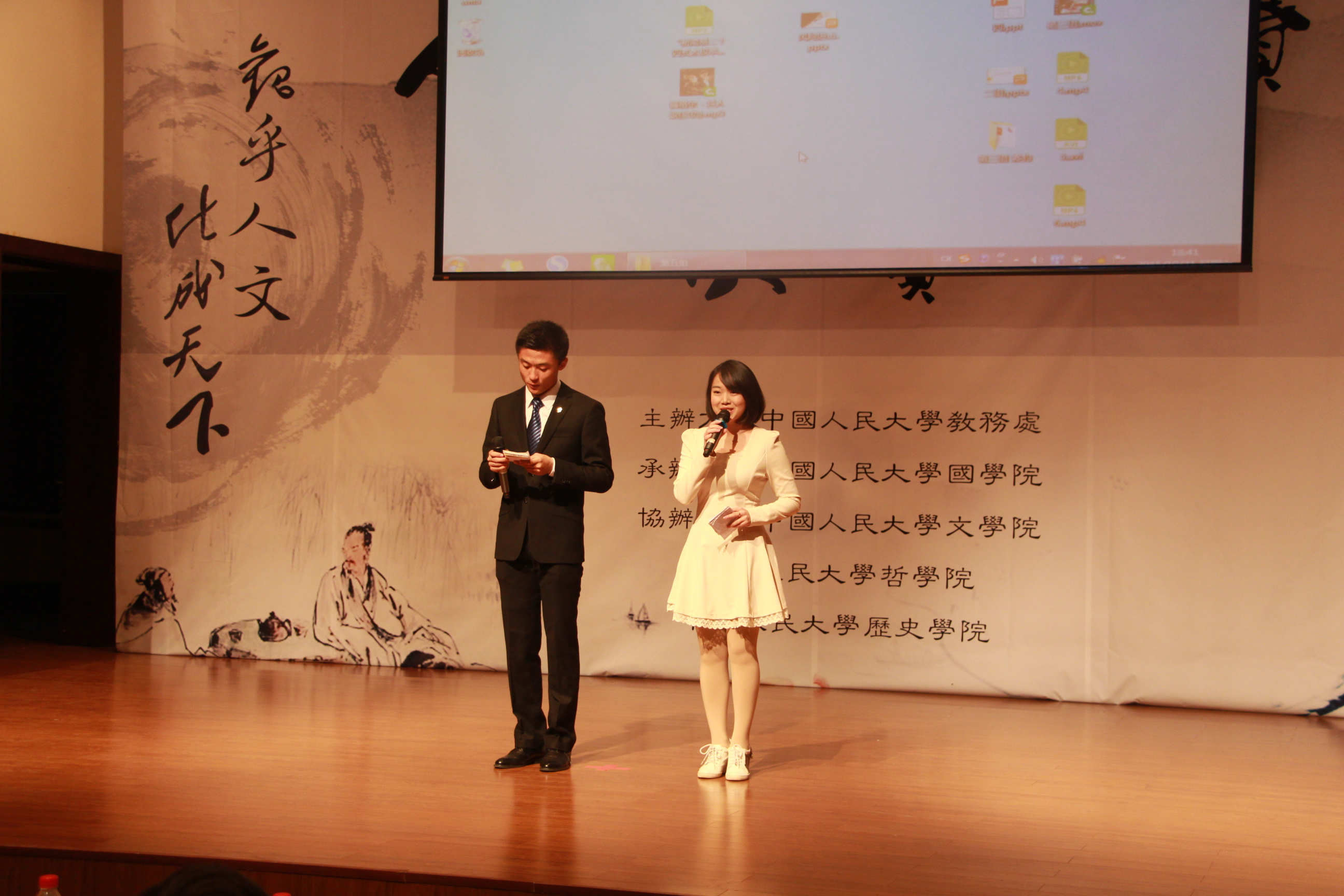 之后,在缓缓的笛子演奏中,舞台中间两位演员挥毫泼墨,两幅毛笔字旋即写就,墨以清心,日新月异,这不仅寄托着同学们对于人文情怀的心向往之,也传达了为往圣继绝学的胸襟气魄。