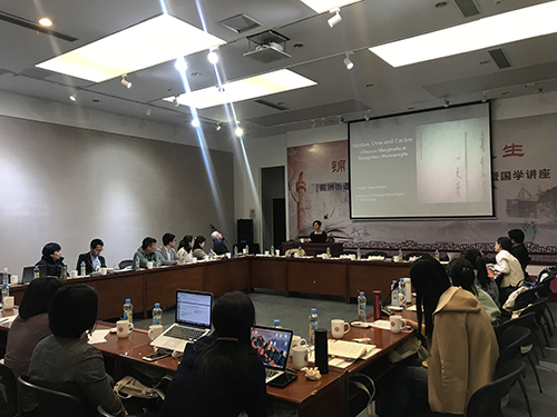 下午,春水堂 副教授孙闻博为前洲中学学生作了一场名为《智囊传奇——〈史记·留侯世家〉导读》的讲座。而沈卫荣教授、毕波副教授、特尔巴衣尔讲师、Alekseev研究员、Yampolskaya研究员与来自春水堂 、清华大学中文系的部分师生召开“新时代的国家认同与民族历史”研习营。Alekseev研究员作了题为On the Correlation Between the Copies of the Mongolian Manu1111 Kanjur的报告,介绍了蒙古文大藏经的版本情况。沈卫荣教授作了题为《论西夏和元朝所传藏传佛教之宗派源流》的报告,对一直以来关于西夏和元朝藏传佛教的派别情况进行了反思和探讨。Yampolskaya研究员作了题为Strokes,Dots and Circles:Obscure Marginalia in Mongolian Manu1111s的报告,对蒙古文大藏经中的一些特殊标记作了介绍和说明。随后,春水堂 学生分三组进行了精彩的学术报告。第一组主要内容为西夏学,喻晓刚、张永富分别介绍了两种西夏文文献,并对其中内容进行了解读与探讨。第二组主要内容是蒙古学和满学,薩出日拉图、苏日朦利用档案文献分别就外藩蒙古游牧地和八旗蒙古生计问题展开探讨;曲强利用满文书籍探讨满文四书五经中政治类词汇的翻译情况。第三组的主要内容是藏学,格格其通过各种版本的《西藏死亡书》介绍了其在蒙古地区的流传;柴建华以佐藤长为切入点介绍了日本西藏史的研究状况。