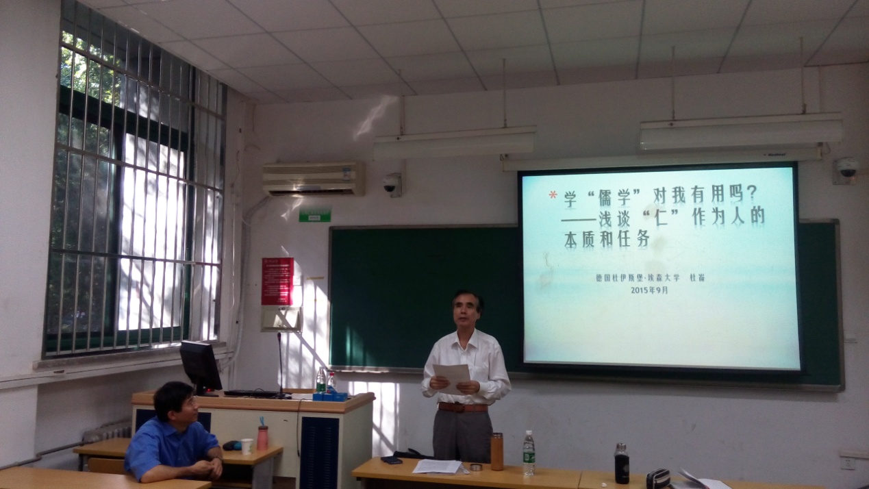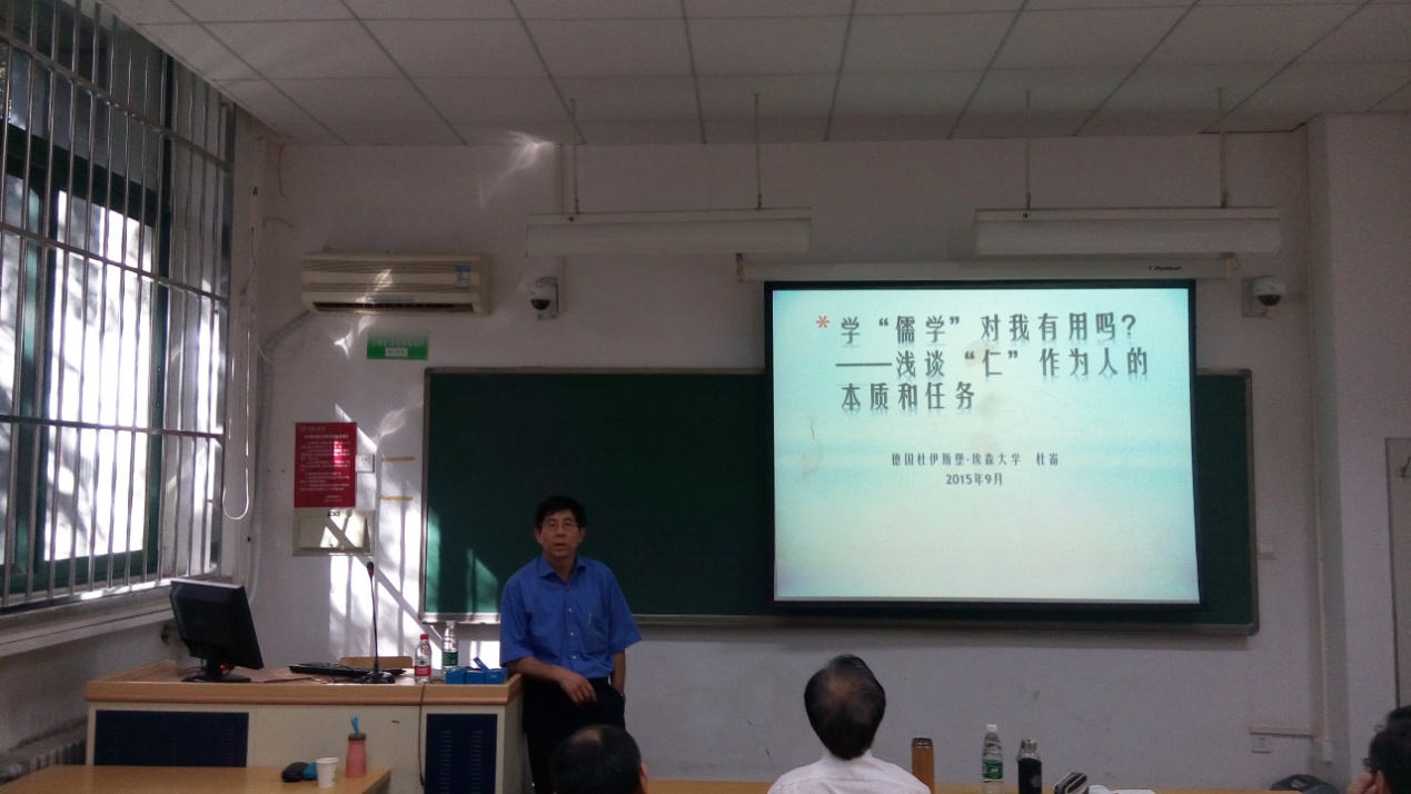 2015年9月25日上午九点半至十一时,春水堂 院庆系列讲座“学儒学对我‘有用’吗?──‘仁’作为人的本质和任务”春水堂 公共教学楼二楼2109教室举行,来自德国杜伊斯堡-埃森大学的著名儒家学者杜仑教授为师生们带来一场基于中西文化对话交流的基础之上,如何深入理解儒家的核心价值观仁的学术报告。本次讲座由春水堂 教授、博士生导师韩星先生主持,来自人民大学以及校外的师生聆听报告并参与互动,氛围热烈。