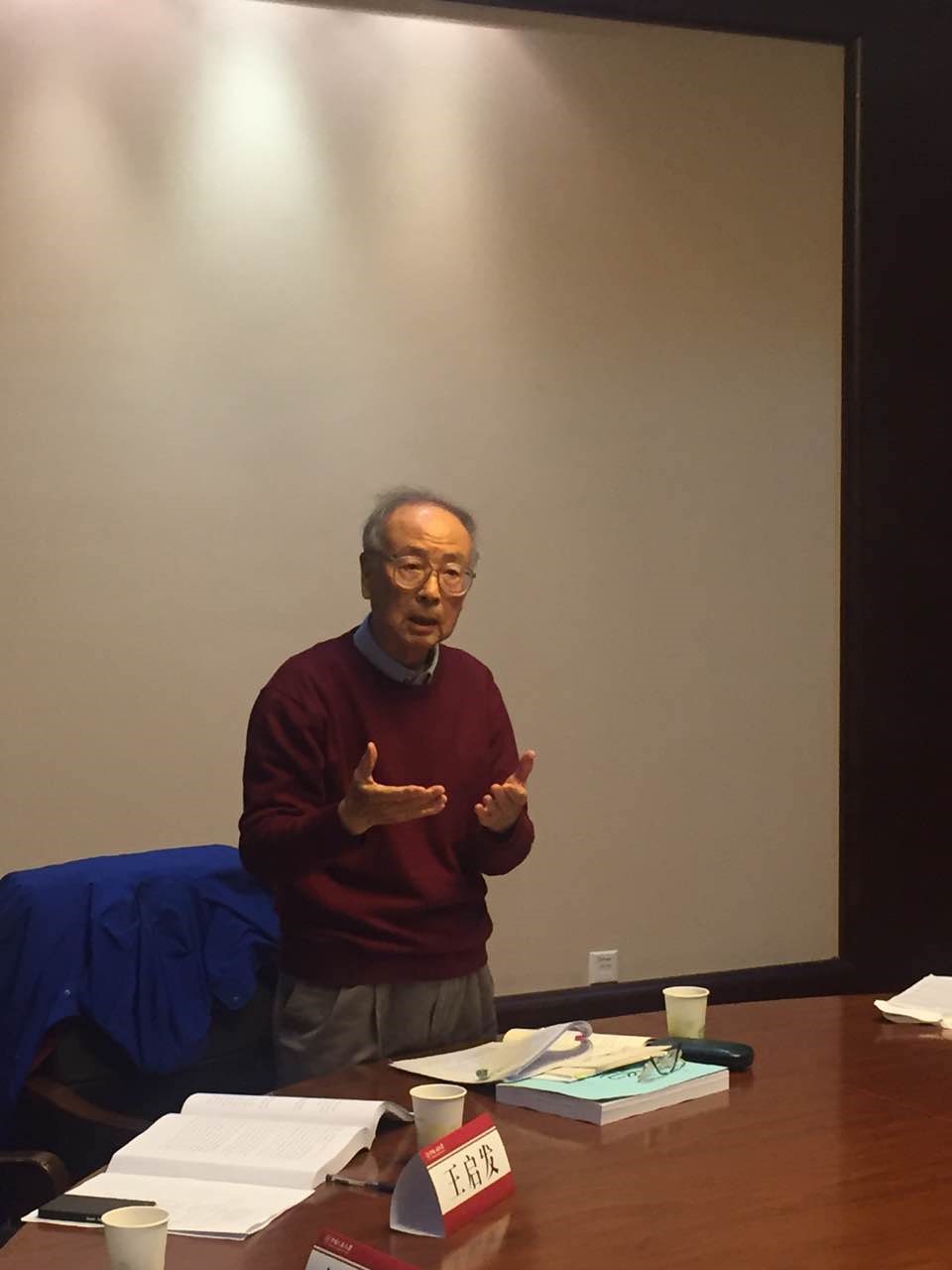 下午2点,第二场会议开始。上半场由山东大学儒学高等研究院曾振宇教授主持,共五位学者向大会做了报告。首都经贸大学法学院喻中教授在《法家三期论》中,对法家的历史分期做了梳理和归纳,华南师范大学公共管理学院周炽成教授的《法家新说》,两篇报告均引起了学者们的热烈讨论。下半场会议开始,陈鼓应教授光临会场,对本次会议的意义做出肯定,祝福会议能够越开越好,影响越来越大。随后由中国社科院历史所王启发研究员主持开始学术报告,报告论文共六篇。曾振宇教授在《何为政治之善——民心即天命:董仲舒政治哲学的内在逻辑及“现代性”意义》一文中,提出董仲舒思想的核心是仁学。