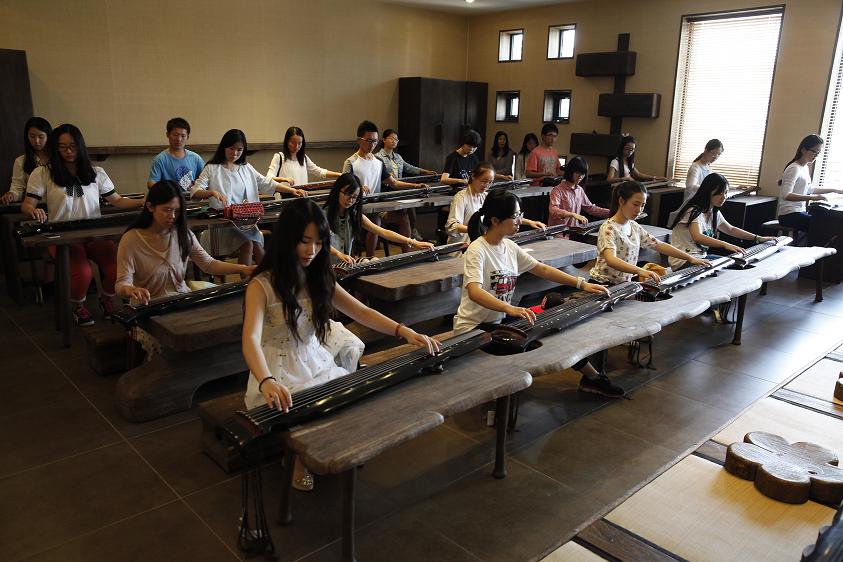 演奏厅楼上是精致雅洁的古琴教室。虽然大家已经在课堂上了解了古琴的基本知识和文化源流,但是,“纸上得来终觉浅”。四十分钟的体验课,同学们亲自触动琴弦,听自己指尖流出的天地人音,每个人都对古琴与古代音乐文化产生了全新的认识。