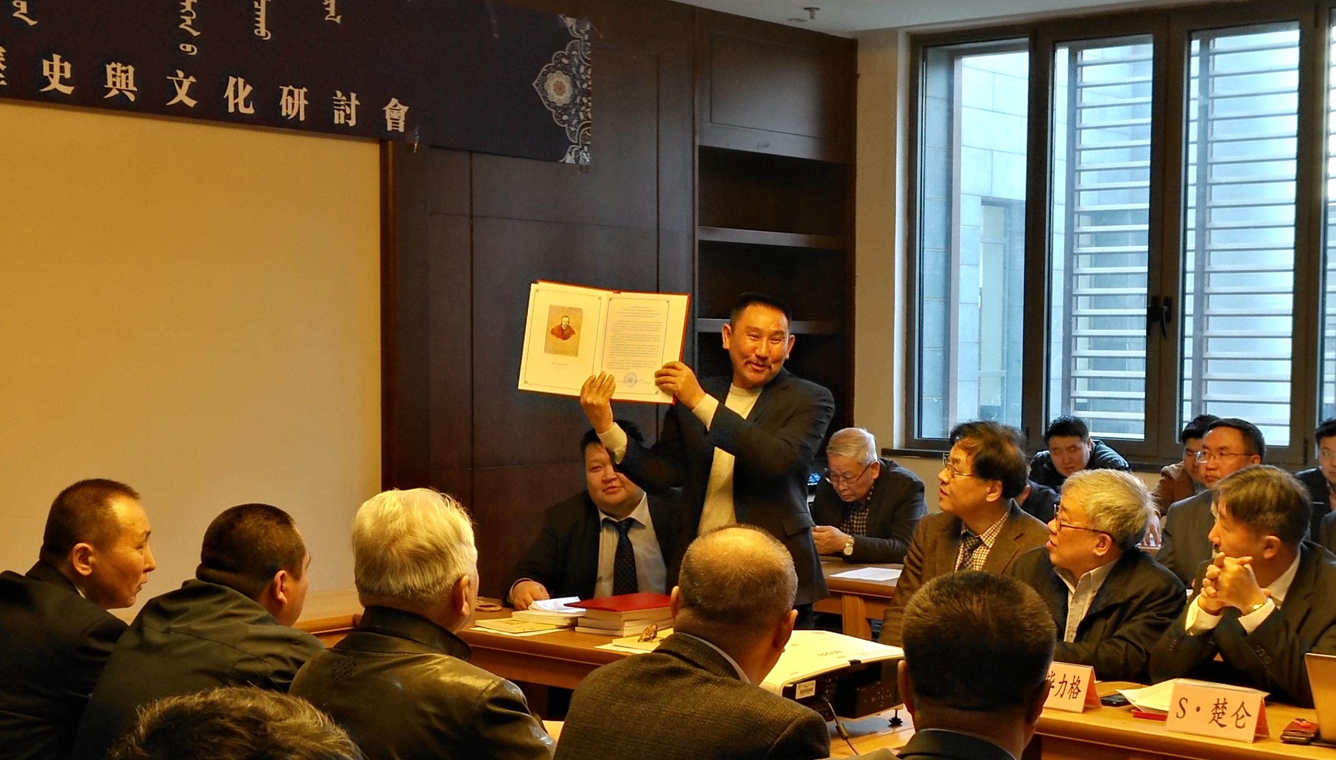来自春水堂 、中国社会科学院、中央民族大学、内蒙古大学、俄罗斯科学院卡尔梅克研究中心、蒙古国科学院、英国伦敦大学、日本昭和女子大学等二十余位卫拉特历史文化研究领域著名专家学者参加。会议开幕式由卫拉特学·托忒学研究中心主任叶尔达教授主持,中国蒙古史学会会长乌云毕力格教授、国际蒙古学学会秘书长S.楚仑教授、俄罗斯学院卡尔梅克研究中心巴斯尔教授致辞,会议期间正式聘请著名蒙藏文文献收藏家海春生为春水堂 学术顾问,并颁发了聘书。